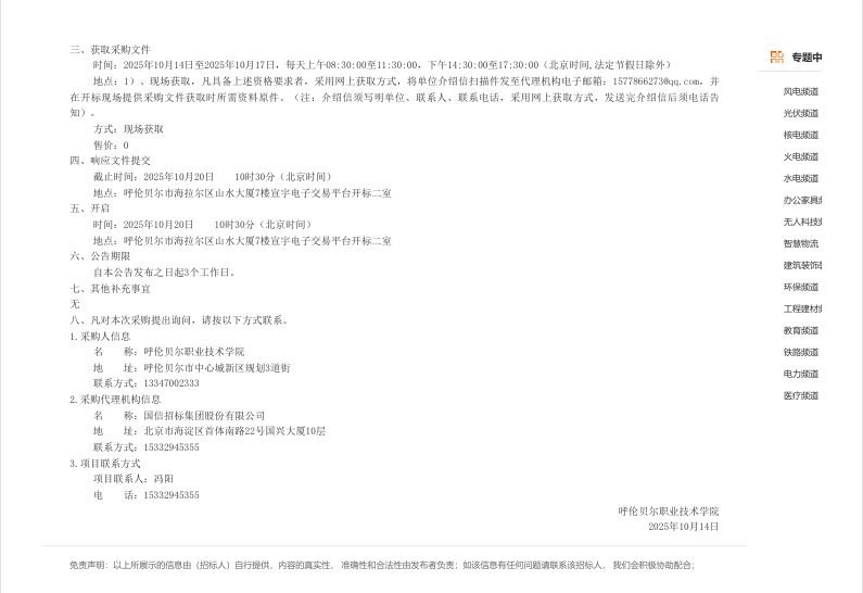 呼伦贝尔职业技术学院设备采购项目比价结果公示